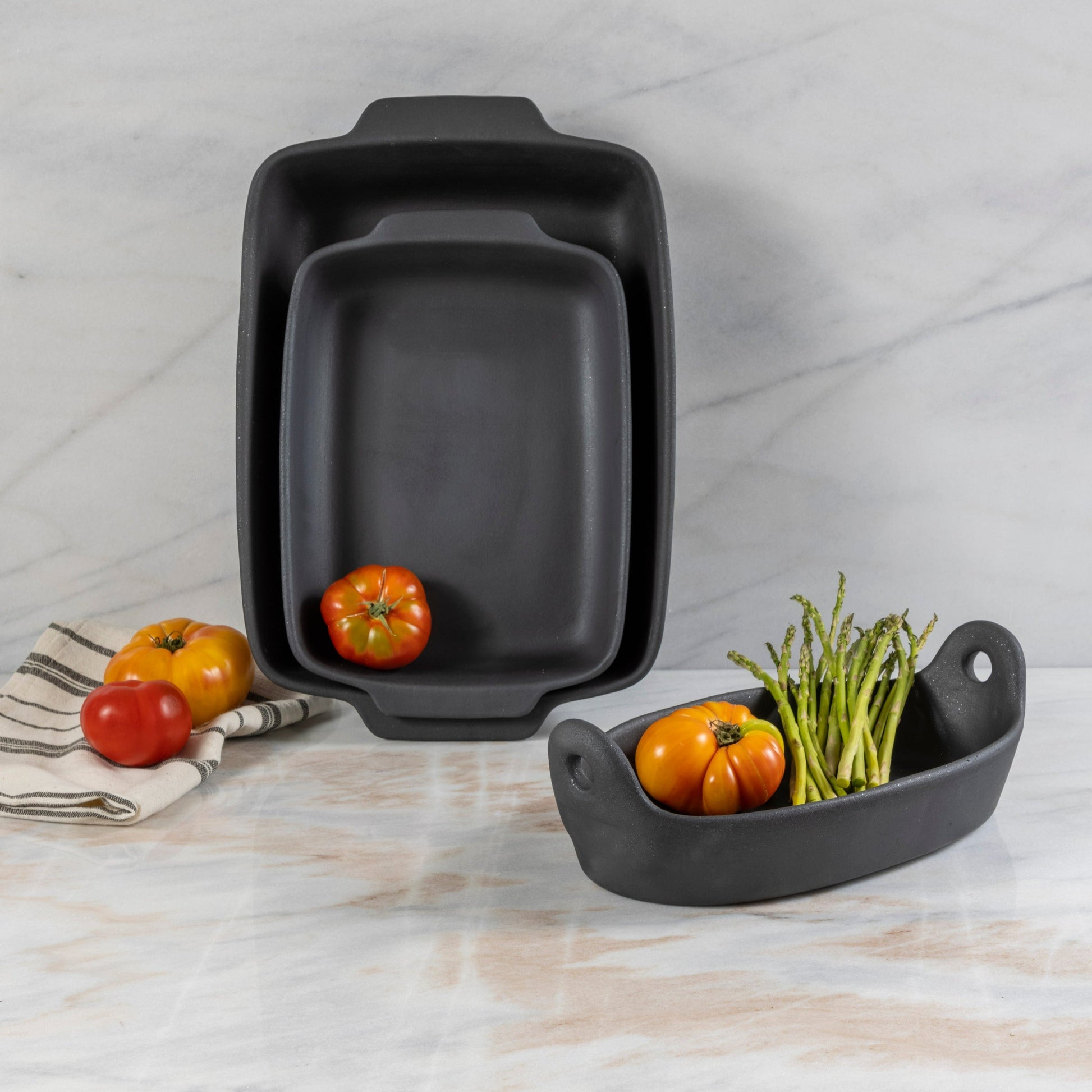 The Barro bakeware collection comes from northern Portugal. Called Barro Negro, or black clay, it is ideal for roasting, braising, and baking. A high fired earthenware without glazing, the length of time and temperature in the kiln develops deep carbonization resulting in the clay becoming a deep graphite like black. Flavor of food prepared in the barro negro is enhanced due to the "steaming" effect which occurs because of the porous quality of clay. Barro Negro bakeware is ideal for serving direct from oven to table.