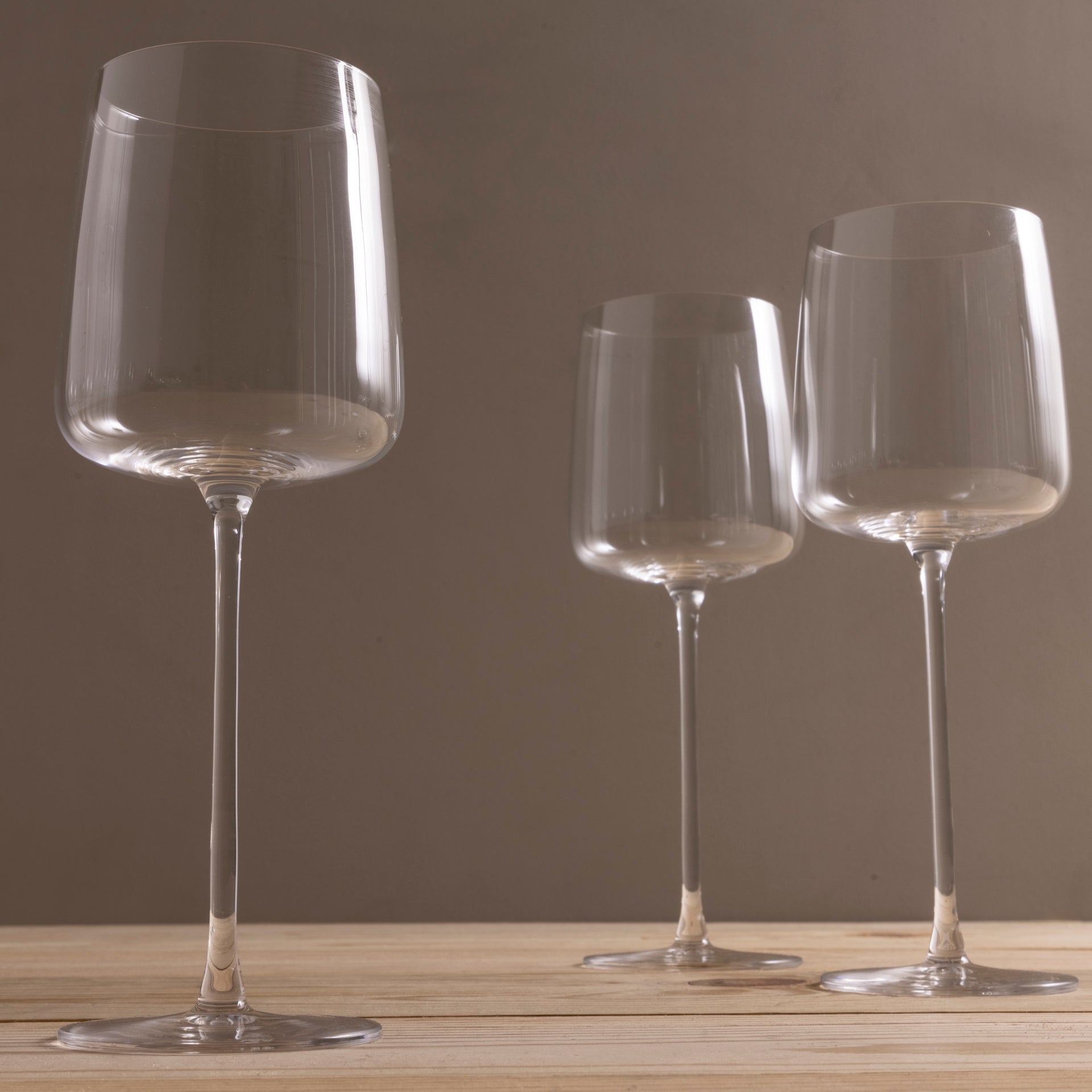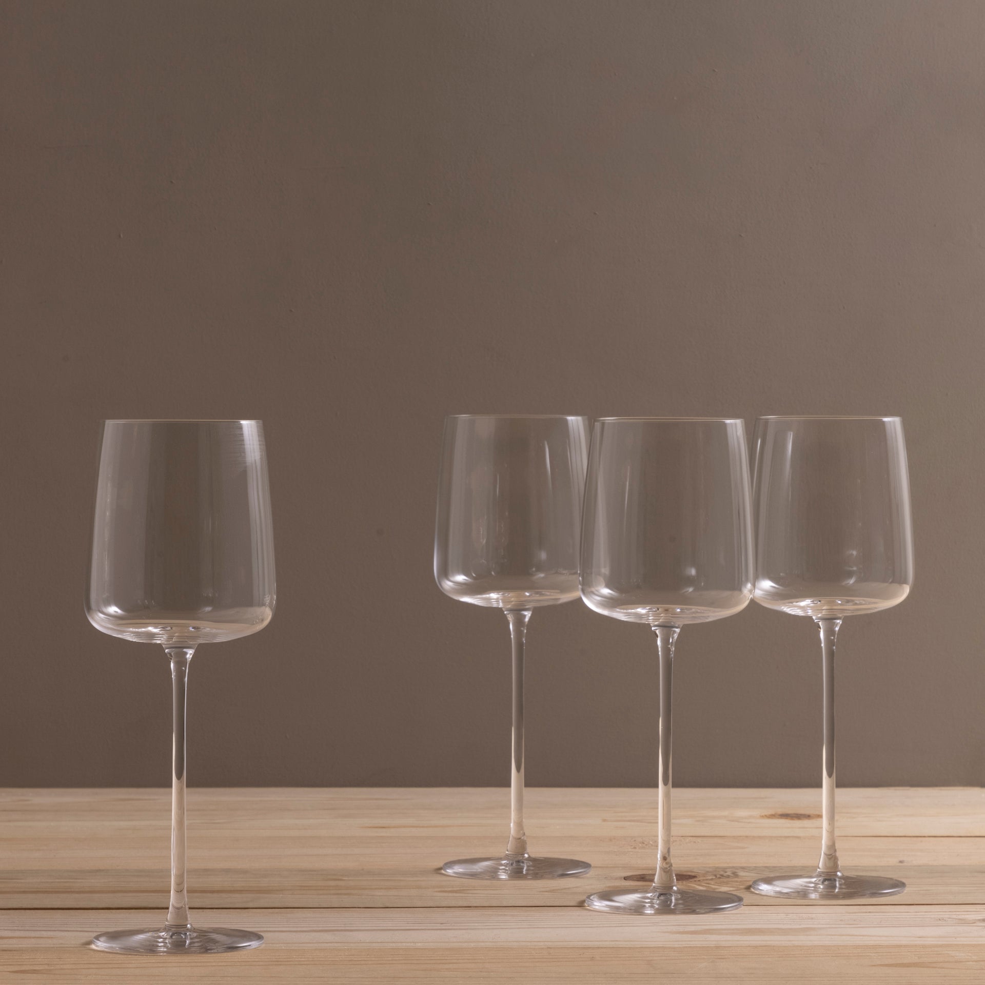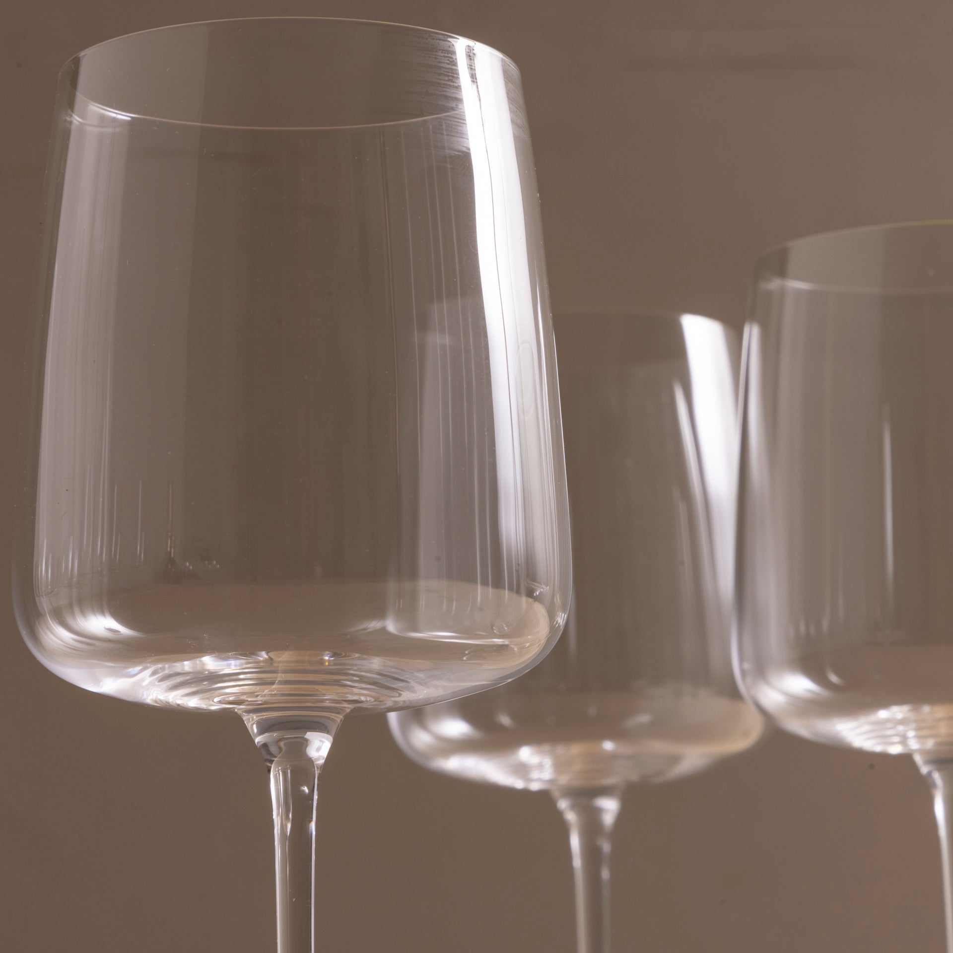 Set of four contemporary wine glasses with tall, elegant stems. The generous angular bowl tapers towards a fine rim. Made from lead-free crystalline glass for clarity and strength.