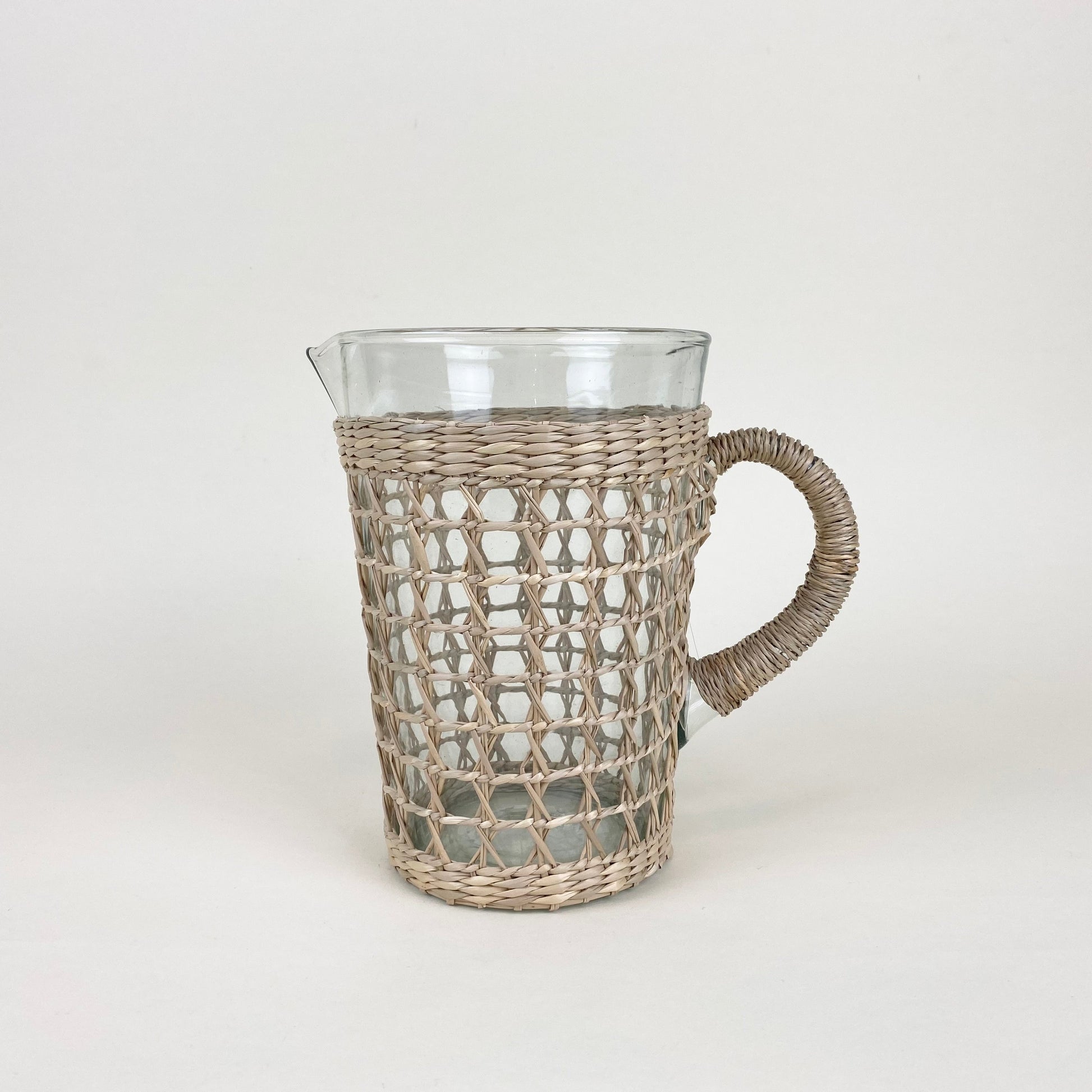 Classic pitcher with pour spout and handle. Caged detailed seagrass wrapping covers all but top.