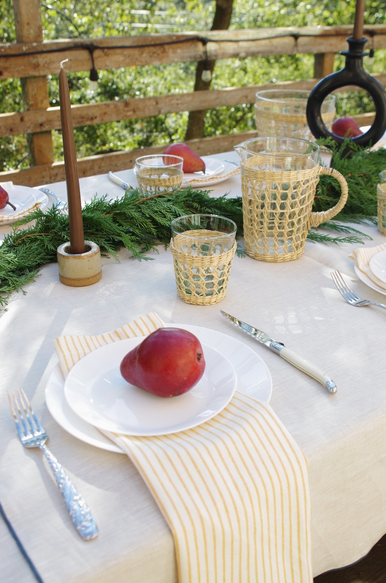 Seagrass meets glassware in this collection, which is an update on an old favorite. Natural wraps on pitchers and matching glassware make festive pieces for indoor and outdoor drinking and dining.