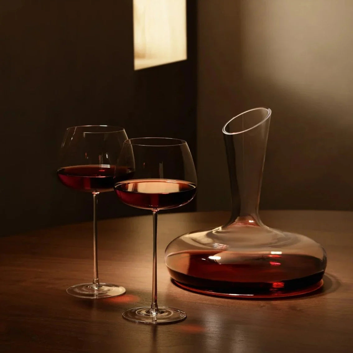 A modern carafe with polished, slanted rim and tall conical neck. The wide base allows maximum surface area for the aeration of wine. Expert craftsmanship is required to create and finish each piece by hand.